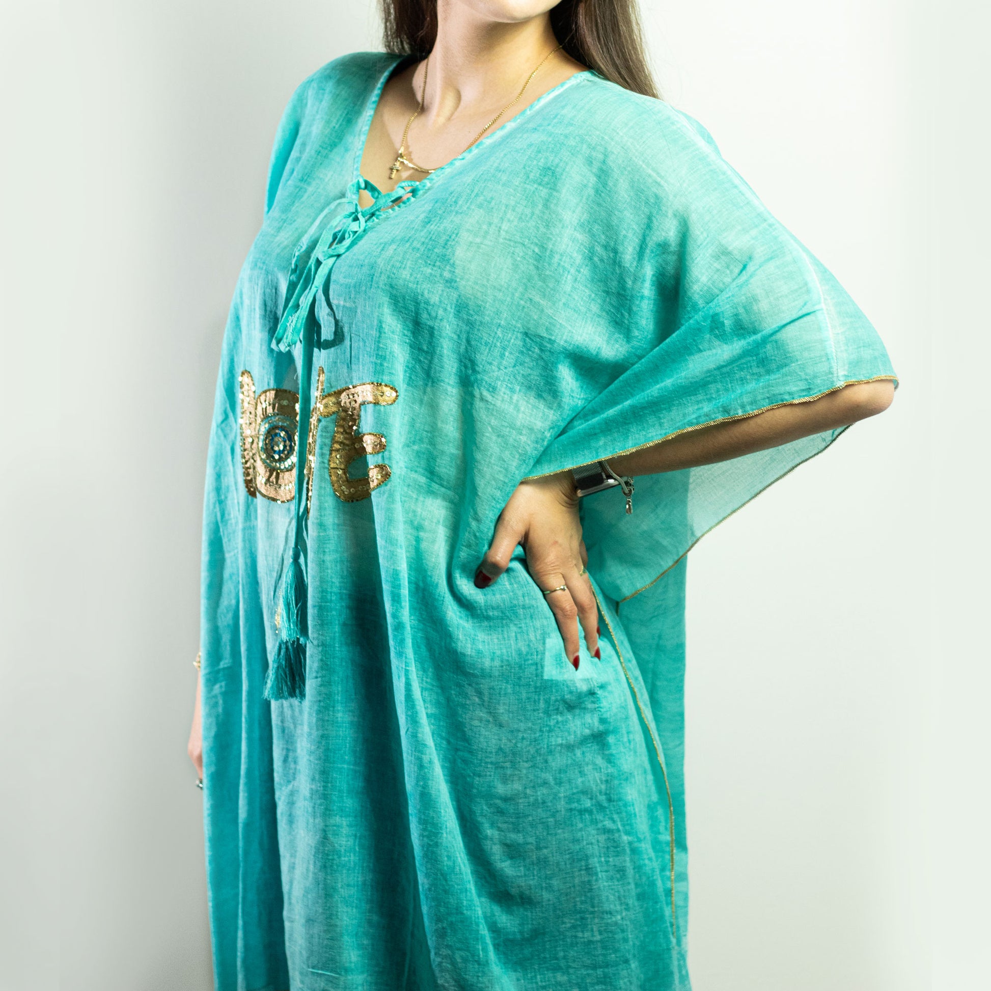 Este modelo turquesa con la palabra LOVE en dorado no solo es visualmente poderoso, sino también simbólico. Está pintado a mano y confeccionado en algodón suave, ideal para quienes valoran la belleza con propósito y buscan prendas ligeras, cómodas y con significado.