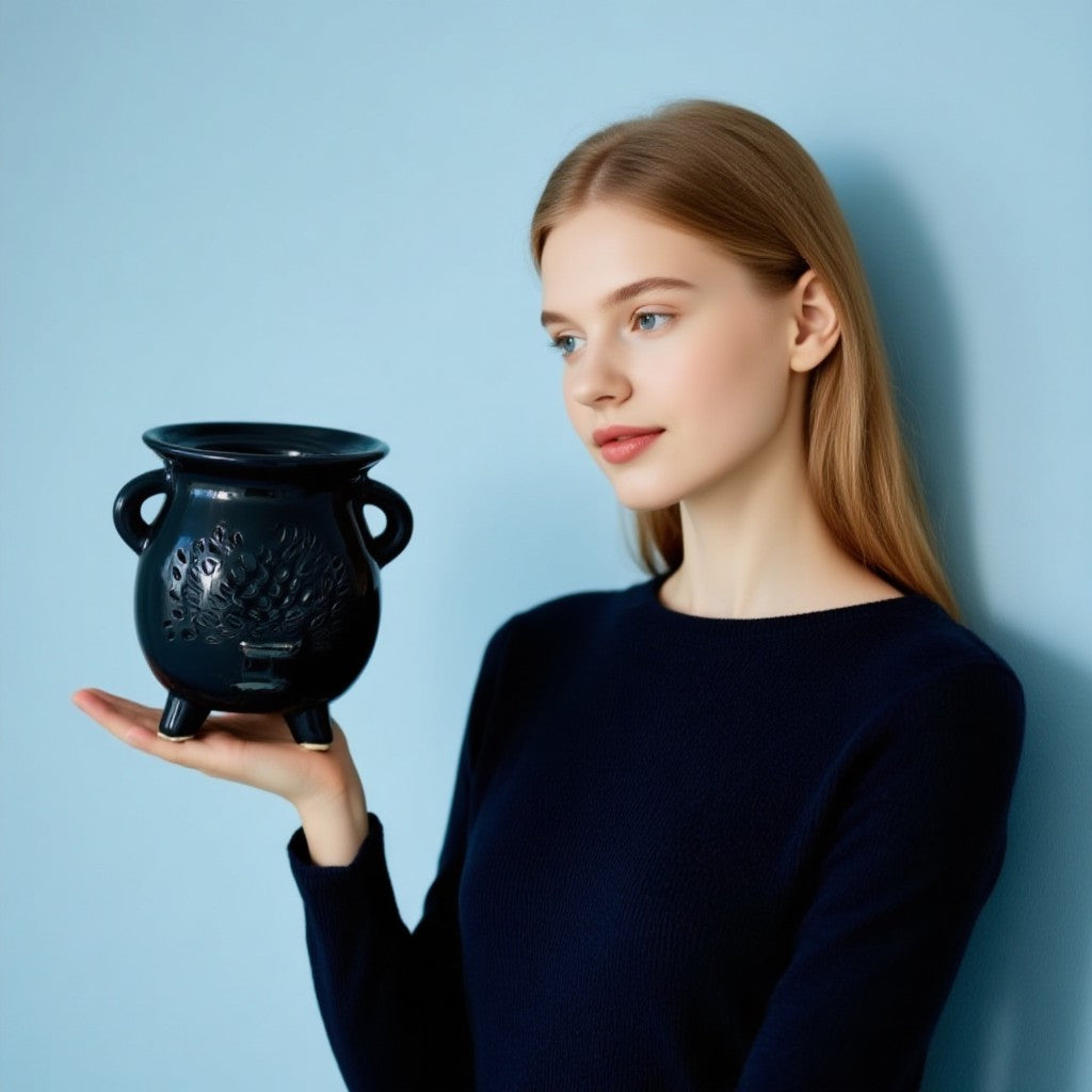 Aporta un aire espiritual y elegante a tu hogar con este quemador de aceite en forma de caldero negro con diseño del Árbol de la Vida.