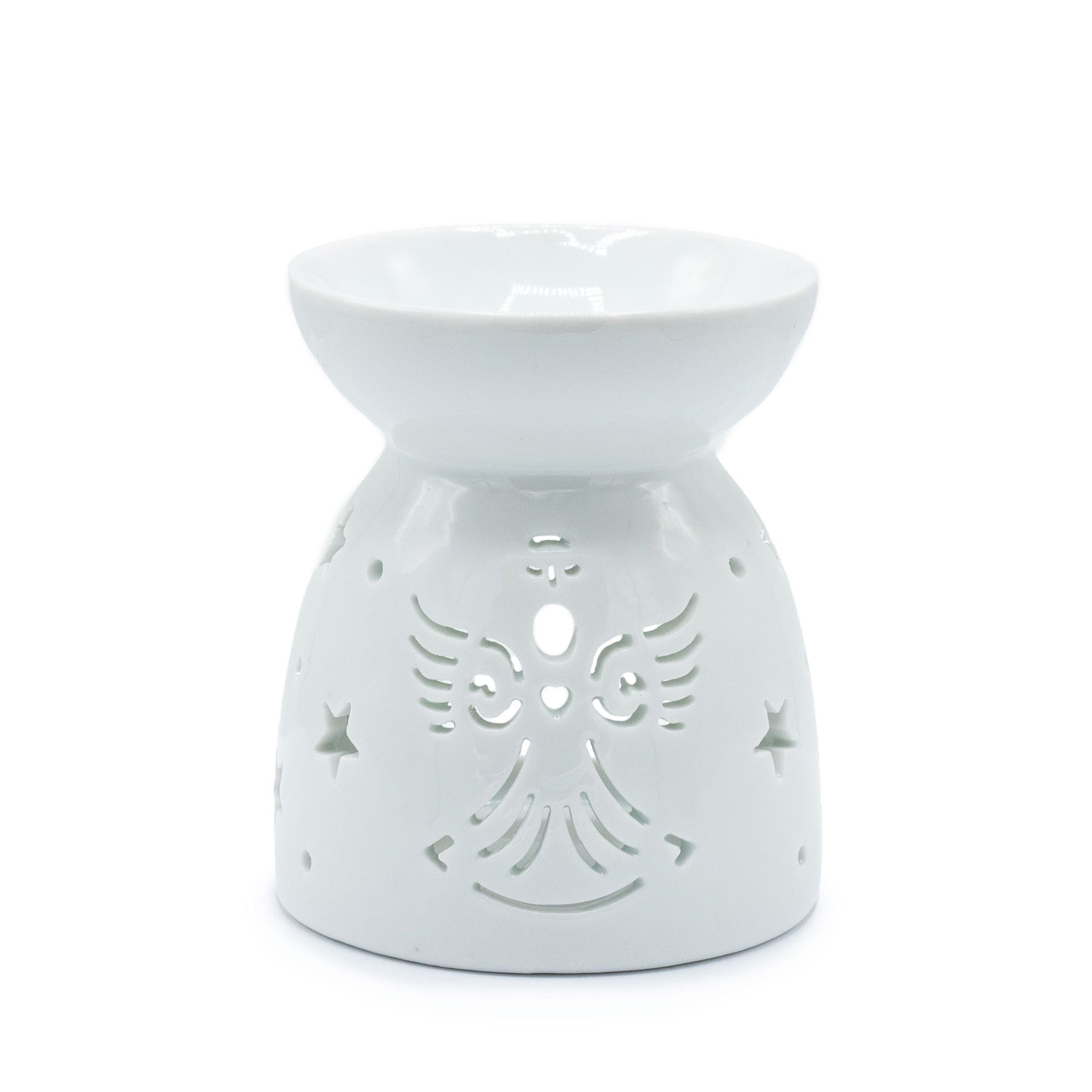 Este quemador de aceite con figura de ángel, elaborado en cerámica blanca, proyecta una luz suave a través de sus detalles calados, creando un ambiente acogedor y espiritual.